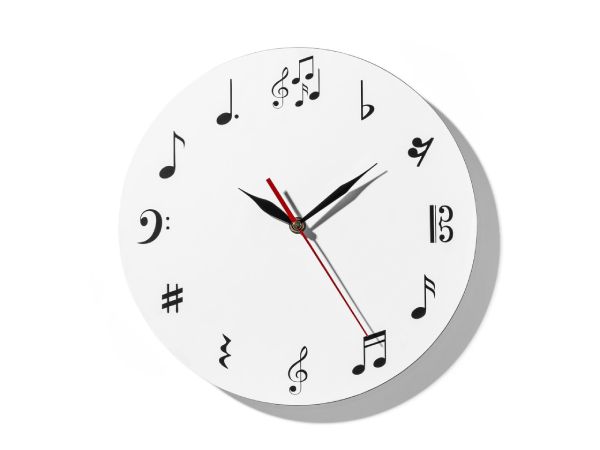 Kello, jonka numerot ovat korvattu nuoteilla ja muilla musiikkiaiheisilla symboleilla.